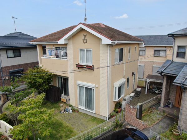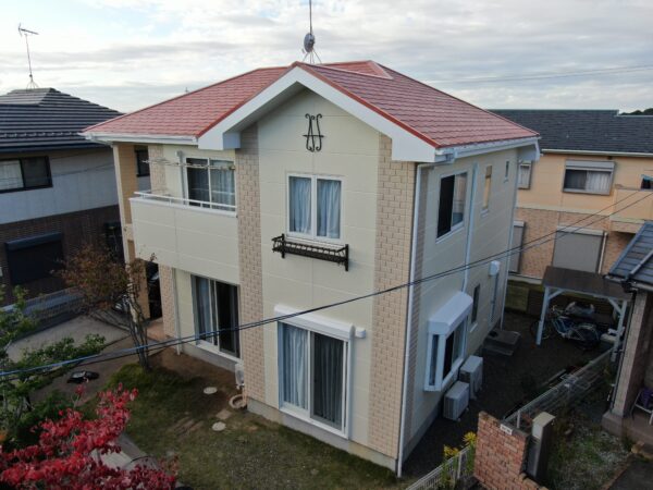 ポスティングチラシをご覧になりお問い合わせいただいたお客様で、複数社で相見積もりをされており、内装リフォーム(トイレ・洗面台交換)もご検討されておりました。塗装の予算を事前に決められている状況でしたので、まずはそのご予算内で最適な施工をご提供できるよう、お客様のご要望を深くヒアリングいたしました。現場調査では、ドローンを活用した詳細な建物診断を実施し、築20年近くが経過した屋根には苔、退色、塗膜剥がれが著しく、外壁のALCにおいても目地コーキングのひび割れが全体に見受けられるなど、塗装工事のみでは補えない深刻な劣化状況を確認いたしました。ご予算を最優先するご意向から「最も安価な塗料で良い」とのお話でしたが、専門家として建物の状態を詳しくご説明し、特に劣化が激しい屋根は安価な塗料を使用する場合でも下塗りを徹底して2回塗り(合計4回塗り)、外壁はALCの特性上、ひび割れ箇所から雨漏りを防ぐためにコーキングの打ち替えが必須であることをお伝えいたしました。このご提案の結果、当初のご予算は超過したものの、建物の将来を見据えた正直かつ具体的な提案を他社からは受けられなかったと大変ご信頼いただき、「予算オーバーでもKirintecに依頼したい」とのお言葉を頂戴し、内装リフォームは時期をずらし他社にて実施されることとなり、外壁・屋根塗装工事のご契約をいただくことができました。その後、カラーシミュレーションを何度も重ね、お客様に心からご納得いただける配色を決定いたしました。着工後、足場組立時に軒天の浮きを発見したため、急遽ビス止めにて補修後に塗装を実施しております。屋根塗装は、色の兼ね合いで色が乗りにくいことが判明したため、上塗りをさらに1回追加し、合計5回塗りの高耐久な仕様へと変更いたしました。工事は順調に進行し、概略工期内に完了いたしました。施主様からは、丁寧な仕事ぶりと最終的な配色に大変ご満足いただけ、「Kirintecにお願いして本当に良かった」とのお言葉をいただき、信頼と実績を積み重ねることができました。見積もりの各項目につきましても、その意味や建物の状態に合わせた工事の必要性、使用する塗料の耐久性や塗膜の厚みの重要性といった見方のポイントを分かりやすく解説し、ご納得いただいた上で施工を進めております。